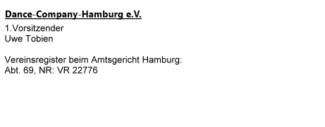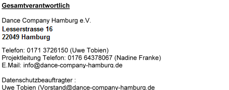 Dance Company Hamburg e.V. bietet Ihnen diese Webseite an, damit Sie sich schnell und umfassend über uns informieren können. Wir bemühen uns, dass die auf unserer Webseite enthaltenen Informationen und Daten zutreffend sind. Eine Haftung oder Garantie für die Aktualität, Richtigkeit und Vollständigkeit der zur Verfügung gestellten Informationen und Daten ist jedoch ausgeschlossen. Dies gilt ebenso für alle anderen Websites, auf die mittels eines Hyperlinks verwiesen wird. Dieter Musterman ist für den Inhalt der Websites, die mittels einer solchen Verbindung erreicht werden, ebenfalls nicht verantwortlich. Wir behalten uns vor, ohne Ankündigung Änderungen oder Ergänzungen der bereitgestellten Informationen oder Daten vorzunehmen. Wir möchten Störungen aufgrund technischer Probleme so gering wie möglich halten und empfehlen Ihnen, sämtliche Möglichkeiten zu nutzen, um solchen Störungen vorzubeugen. Es ist allerdings nicht ausgeschlossen, dass einige der Daten und Angaben auf unserer Webseite in nicht fehlerfreien Dateien oder Formaten angelegt/strukturiert sind, und wir können keine Gewähr dafür übernehmen, dass unser Dienst nicht unterbrochen oder anderweitig durch derartige Störungen beeinträchtigt wird. Dieter Musterman übernimmt jedoch keine Verantwortung für solche Probleme, die aufgrund der Benutzung dieser Webseiten oder damit verbundener externer Webseiten entstehen könnten.